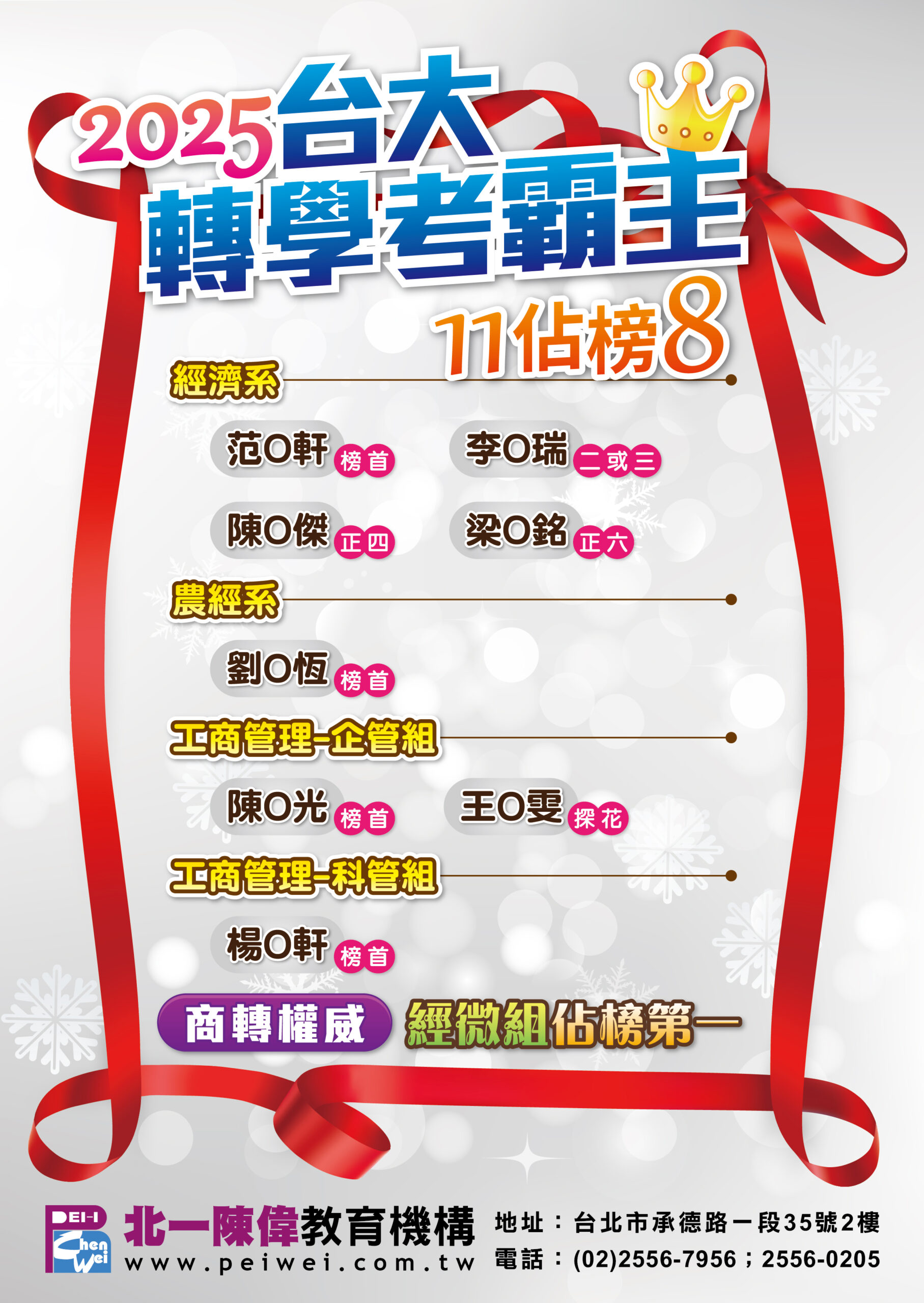 2024台大綁2024台北大高手在北陳大一新生2025大一微積分大一微積分蕭弘會計 課輔家教2024五專升學 二技統測 插大轉學考銀行招考記帳士北一陳偉吳限 大學微積分 轉學考試 0 2026/06/28 會丙考試 0 2025/11/02 記帳士考試 0 2025/11/15 最新榜單 學長姐心得分享 簡章及考古題 就愛與眾不同 最新消息 了解更多 2025台大轉學考榜單在北陳 Posted on2025 年 8 月 25 日2025 年 8 月 25 日 《徐喬+吳限+蕭弘》大學轉學考歷屆試題解析分享 Posted on2025 年 6 月 30 日2025 年 6 月 30 日 會計、經濟 與 微積分 歷屆試題精選解析 https://w ... 想念台大、政大何必重考?在鍍金學歷前先瞭解大學轉學要重讀嗎 Posted on2025 年 6 月 13 日2025 年 6 月 13 日 轉學考結果對於個人學歷和未來職業生涯有著不小的影響,台大和政 ... 繁星學測放榜!大學新生快速了解大一微積分的重要性 Posted on2025 年 5 月 20 日2025 年 7 月 4 日 大一微積分跟你想的不一樣 #繁星 #學測 錄取後,許多進入大 ... 開班資訊 了解更多 2026轉學考|9/24(三)秋季班新班各科陸續開課啦✮大一專業加強&大學轉學考 商管唯一選擇✮ Posted on2025 年 9 月 1 日2025 年 9 月 29 日 大一新生更要贏在起跑點 準備轉學考時間長短因人而異,有些同學 ... 2025轉學考|書審專班─最新!轉學考書審學校/系所一覽表 Posted on2025 年 5 月 8 日2025 年 6 月 1 日 大學轉學考書審 大學轉學考是一種讓在校大學生改變自己就讀的學 ... 2025記帳士|4/18新班開課,現在報名基礎課程搶先上讓你贏在起跑點★會計與法科名師聯手出擊★ Posted on2025 年 2 月 9 日2025 年 3 月 6 日 記帳士證照是國家認可合法從事稅務、會計相關工作之證明。 記帳 ... 會計丙檢|2025會計王牌蕭弘老師全新面授課程 Posted on2024 年 12 月 13 日2025 年 3 月 9 日 會計丙級檢定輔考班 | 考照班/考證班 大家都知道房子想蓋高 ... 考情NEWS 了解更多 臺大轉學考考前如何準備?把握第一手資訊就看這篇 Posted on2025 年 9 月 29 日2025 年 9 月 29 日 在經歷一年的學習後,可能已經發現該學校或科系不是這麼適合自己 ... 大學選什麼系?轉學考選商學院更具「錢」瞻性 Posted on2025 年 9 月 10 日2025 年 9 月 29 日 大學選系與轉學考該走什麼方向? 商學院具備的絕對優勢 商管學 ... 銀行招考擴大徵才,1分鐘掌握公股銀行考試 Posted on2025 年 8 月 18 日2025 年 8 月 12 日 除了科技業、公職考,高薪的銀行職缺也是大眾夢寐以求的金飯碗, ... 5分鐘看懂最佳轉學考書審範例!升學自薦全靠它 Posted on2025 年 5 月 3 日2025 年 5 月 3 日 絕大部分的大學在經過一到兩年的學習生涯後可能會發現就讀學校或 ... 基礎入門專區 線上試聽 了解更多 微積分-吳限 會計-蕭弘 統計-陳浩 經濟-徐喬 經濟-王道 國文-李華 英文-李棋 法科-張季 名師 專業 輔導 教材 考制 服務